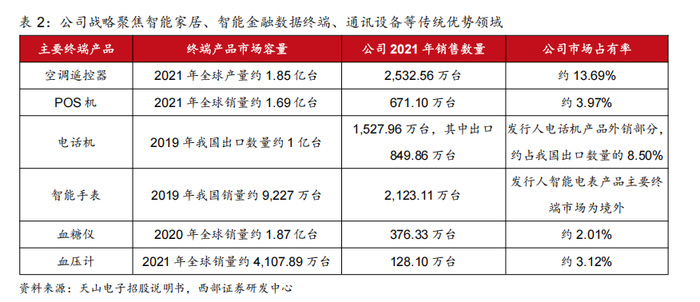 公司战略聚焦传统优势领域重点突破,出货量稳步增长。公司产品主要应用于智能家居、智能金融数据终端、通讯设备、工业控制及自动化、民生能源、健康医疗、车载电子等领域,根据公司招股说明书数据,2021年天山电子在空调遥控器、POS机、血糖仪、血压计类产品所需液晶显示产品的全球市场占有率分别约为13.69%、3.97%、2.01%、3.12%。由于电话机类产品所需液晶显示产品占我国出口电话机数量的比约为8.50%,公司在该应用领域具有较强的市场竞争力并仍有充分成长空间。2023年公司总出货量超过100KK pcs,继续保持高速增长势头。