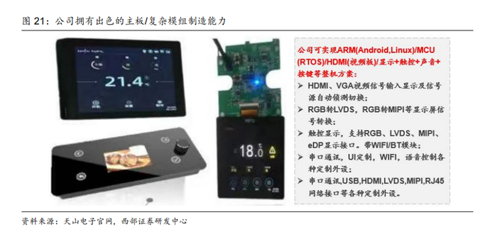 产品端:公司拥有出色的主板/复杂模组制造能力,可提供软硬件一体化的整体解决方案。公司深耕液晶显示模组领域多年,目前已经掌握智慧串口显示模组、屏显驱动+结构复杂模组、Mini LED背光触显模组、异形触控面板、大尺寸触控模组等核心技术,可将驱动方案、结构件、各种功能模块(如主板、蓝牙模块、WIFI模块)等与液晶显示屏集成化的研发和生产制造能力,可提供满足ARM(Android,Linux) /MCU(RTOS)/HDMI(视频板)/显示+触控+声音+按键等整机方案。目前公司模组产品涵盖高亮TFT液晶模组、人工智能终端一体TFT液晶模组、曲面异形TLCM总成模组、一体黑液晶模组、镜面液品模组、VA与TFT组合液品模组压铸一体成型结构液晶模组等。我们认为,复杂模组制造能力是公司可以快速提供整体设计方案、并具备定制化、规模化产品的快速交付能力的关键。