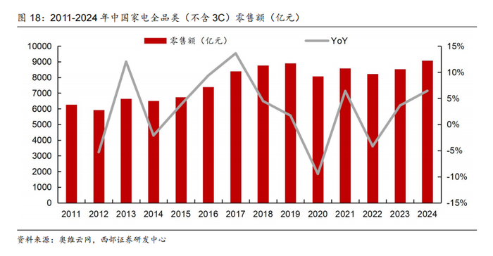 1)智能家居:24年国补政策落地,液晶电视、空调等家电类产品迎来快速增长。根据奥维云网(AVC)数据,2024年中国家电全品类(不含3C)零售额9071亿元,同比增长6.4%;其中9071亿元是继2019年8910亿元之后的新记录。以彩电为例,据GfK中怡康数据,24年国内彩电市场零售量额规模达到3251万台、1301亿元,其中24H2国补政策落地后彩电双线市场都达到增长高峰,24年10月国内彩电线上、线下的零售额同比增速分别达到98.5%和56.0%,零售量增速分别达到52.7%和66.2%。