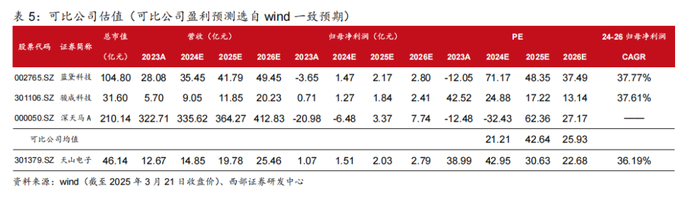 我们预计天山电子2024-2026年营收分别为14.85/19.78/25.46亿元,归母净利润分别为1.51/2.03/2.79亿元。采用可比公司估值法,我们预计天山电子2025年目标市值60.26亿元,目标价42.47元,首次覆盖,给予“买入”评级。
