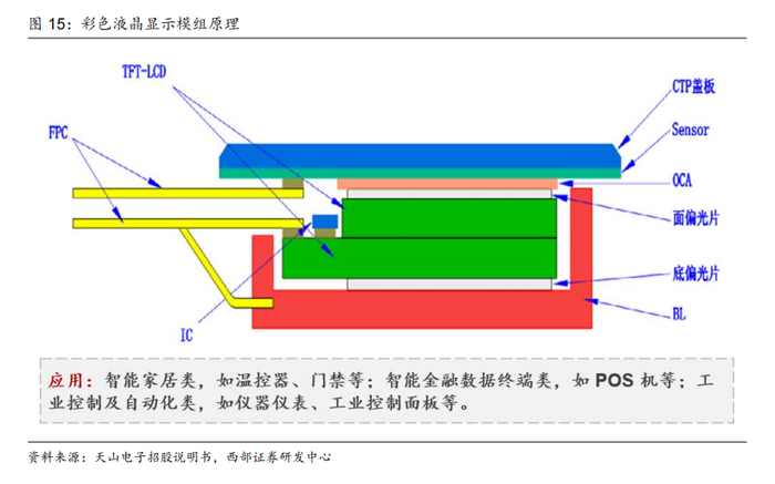 2)彩色液晶显示模组:彩色液晶显示模组的技术原理是利用薄膜晶体管驱动液晶分子,改变液晶分子的排列状态,再结合彩色滤光片以实现彩色显示;同时将彩色液晶显示屏和 IC、BL(背光源)、FPC(柔性印刷电路板)、TP(触控屏)以及连接件等组件组装在一起,实现显示信号的输入端与显示信号的输出端对接。
