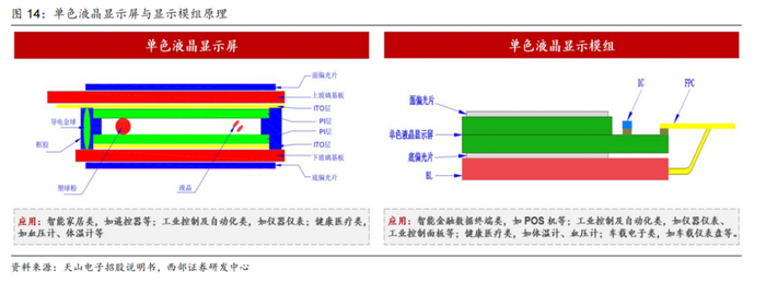 1)单色液晶显示屏与显示模组:单色液晶显示屏是一种利用液晶的光电效应来实现黑白显示的单色显示器件,其利用外界电场的作用使液晶分子发生偏转,改变液晶分子的排列状态,从而透过或阻挡可见光来实现黑白显示;而单色液晶显示模组是将单色液晶显示屏和 IC、BL(背光源)、FPC(柔性印刷电路板)、TP(触控屏)以及连接件等组件组装在一起,可实现显示信号的输入端与显示信号的输出端对接。