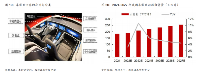 3)车载电子:车载显示屏属于车载电子重要组成部分,是与液晶显示屏和显示模组直接相关的产品,主要应用在抬头显示、中控屏、组合仪表盘和娱乐系统等方面。随着汽车智能化的发展,中控屏从机械表盘、电器仪表盘发展到全数字仪表盘和曲面触摸屏。随着智能座舱发展,车载液晶显示市场持续增长。根据观研天下数据,2021年我国车载显示器出货量达183.4百万片,预计2027年出货量可实现255.5万片;市场空间方面,根据QYR恒州博智数据,2024年全球车载液晶显示屏市场销售额达到了4.14亿美元,预计2031年将达到6.07亿美元,2025-2031年CAGR为5.7%。