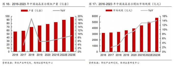 液晶显示产业链持续向国内转移,国内液晶模组市场稳步增长。2018年以来,日韩厂商逐渐放弃或裁剪液晶显示面板产线,中国大陆厂商不断增建产线,使中国大陆成为全球主要的液晶显示面板生产区。液晶显示面板生产量在中国区域集中,带动更多液晶显示模组在中国产出,推动行业市场规模的增长。随着车载显示等新兴领域蓬勃发展,预计未来中国液晶显示模组产量的增速将逐渐上升。根据华经产业研究院数据,2023年中国液晶显示模组产量为97.8亿套,同比增长9%;2023年中国液晶显示模组行业市场规模5733.3亿元,同比增长14%。