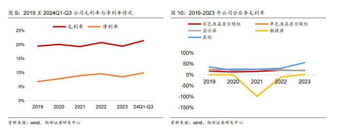 费用端:公司期间费用控制整体有效,研发费用支出持续增长。2019-2023年公司三费率总和(销售、管理、财务费用率)分别为8.17%、8.12%、6.07%、4.49%、5.52%;24Q1-Q3公司销售/管理/财务费用率分别为3.72%、3.06%、-0.98%。研发费用方面,公司近年来加大研发投入,成果丰硕,目前公司在液晶显示屏、液晶显示模组等方面自主研发了63项专利,2019-2023年公司研发费用为0.22/0.22/0.37/0.54/0.56亿元,呈稳步增长趋势。