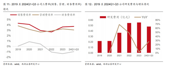 毛利端:公司毛利率常年稳定在20%左右。2019-2023年公司毛利率分别为19.44%、20.05%、19.28%、20.72%、19.41%,保持稳定;24Q1-Q3公司毛利率21.39%,继续稳定在20%左右。净利率方面,2019-2023年公司净利率分别为6.79%、7.78%、8.93%、9.59%、8.48%,24Q1-Q3公司净利率9.90%,稳中有升。