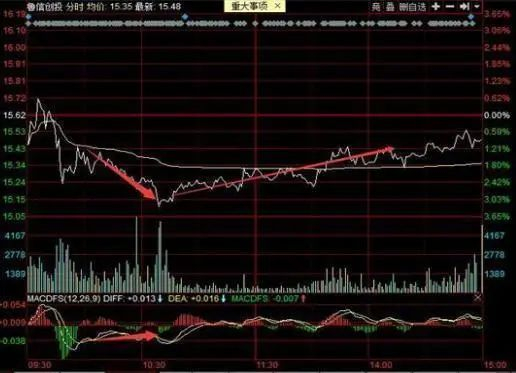 首先先教大家一个成功率非常高的盘中看涨信号,看分时走势与MACD指标底背离情况,当分时走势与MACD形成底背离时,股价会出现上涨行情。