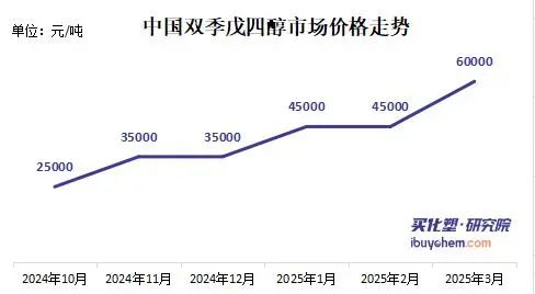 2024年10月至今,双季戊四醇价格已翻倍,2024年10月双季戊四醇价格在2.5万元/吨,12月价格涨至3.5万元/吨,2025年1-2月4.5万元/吨,3月价5.5万元/吨,预计后期仍有上涨空间。