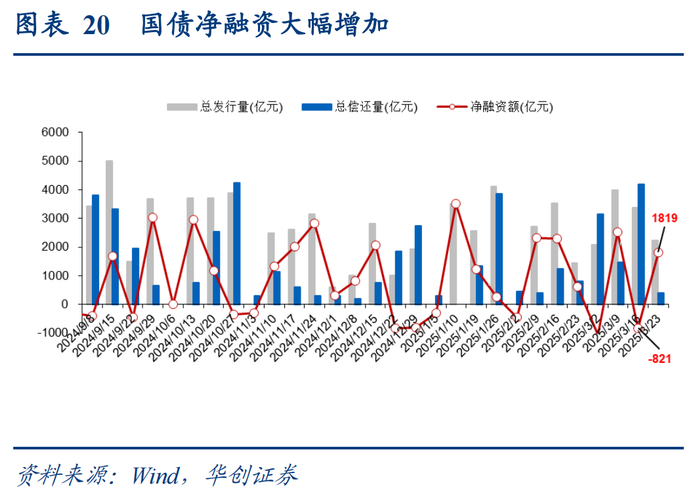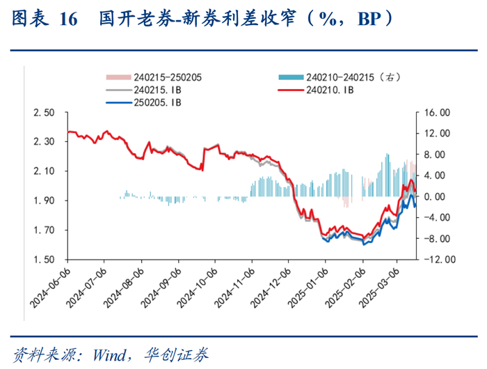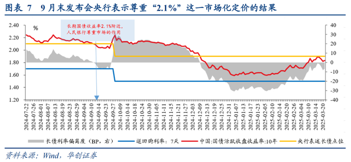 (3)央行卖债操作对于OMO+40bp的确认:2024年在7月货币政策框架改革之前,10y国债始终高偏MLF-30bp,当10y国债下行接近MLF-30bp时(4月下旬接近2.2%)央行频繁对长债收益率进行表态;2024年7月货币政策框架改革后,8月2日(周五)10y国债下行接近OMO+40bp(彼时为2.1%),8月5日(周一)10y国债盘中下行突破2.1%,央行启动卖债操作,收益率开始上行调整。