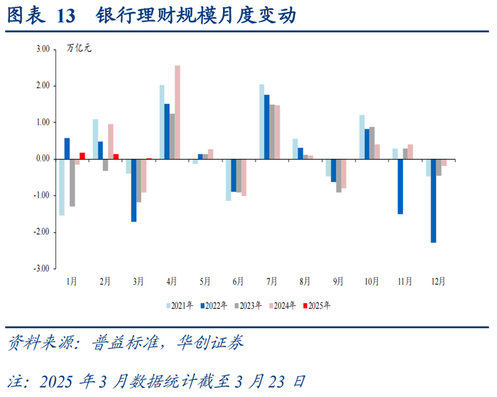 下月DR007或仍维持1.7-1.8%附近,存单价格或延续DR007加点10bp左右的均衡位置。(1)从季节性来看,伴随着季末财政支出的助益以及企业开工进度的加快,资金面多会季节性修复。不过,考虑银行负债距离充裕状态仍有一定距离,以及央行依然强调“防空转”“稳汇率”等,预计4月DR007月均值较政策利率的偏离度或回到20-30bp,对应DR007在1.7-1.8%附近。(2)若DR007按照偏高OMO利率20-30bp(1.7-1.8%)进行考虑,R007与DR的价差按照10bp的均值叠加(1.8-1.9%附近),从融出及配置存单的替代性比较,1y国股行存单1.9%以上的位置或仍有较高的配置性价比。待跨季后理财规模季节性增长,或有望带动其定价小幅修复。