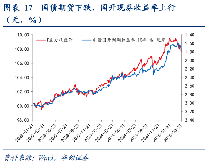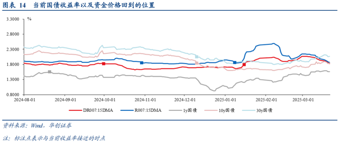 但交易盘没有太多空间,主要观察资金价格。目前10y国债和30y国债收益率基本回到2024年12月上旬央行提及“适度宽松”、市场尚未显著抢跑的位置。对比来看,2024年11-12月DR007在1.6%-1.7%(高于OMO 10~20bp),考虑当前央行维持DR007在1.8%水平并未显著影响实体融资量价及稳增长操作,进入4月DR007或仍高于政策利率OMO 20~30bp,则长端品种并无明显交易空间,10y国债或仍维持1.8-1.9%的震荡区间平稳跨季。