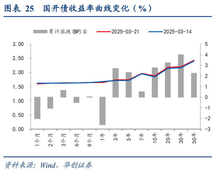 3月第三周,税期央行加码流动性投放,资金面先紧后松,债市呈现企稳修复态势,周四税期过后央行继续净投放提振市场情绪,叠加权益市场调整,债市明显走强。周五央行重回净回笼,10y国债活跃券盘中最低触及1.805%后向上回调至1.8325%。全周累计看,7y国债活跃券收益率上行1.8BP至1.788%,10y国债活跃券收益率下行1.25BP至1.8325%,30y国债活跃券下行1BP至2.06%。