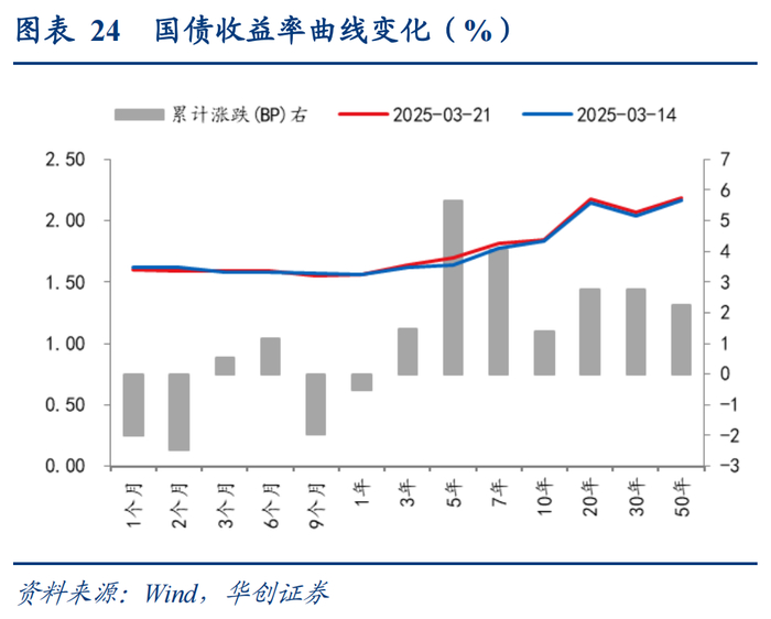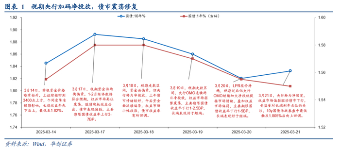 具体看,为应对税期,本周央行公开市场净投放3785亿元,资金面先紧后松,资金情绪指数盘中最高至60,银行间隔夜资金价格回落至1.8%下方,国股行3M、1Y存单发行价格下行至1.92%、1.93%附近,1y国债活跃券收益率下行0.5BP至1.55%。周一,央行OMO净回笼25亿元,税期资金面均衡偏紧,1-2月经济数据符合预期,权益市场强势压制债市,主要期限国债收益率上行3-7BP。周二,央行转为大幅净投放2356亿元,债市情绪较好,午后资金面继续收敛,债市短暂下行后几乎回吐全天涨幅。周三,税期走款央行继续净投放,权益市场弱势震荡,尾盘资金转松带动债市收益率转向下行。周四,3月LPR报价持稳,税期过后央行仍继续加大净投放,资金情绪指数回到50下方,叠加权益市场调整,主要期限国债收益率继续大幅下行。周五,早盘央行重回净回笼, 10y国债活跃券最低触及1.8050%后向上回调,权益市场大跌助力午盘债市情绪,受一季度货政例会监管关注长端利率点位的预期影响,午后债市情绪再次转弱,10y国债上行至1.8325%。