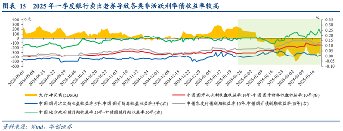 操作建议:(1)配置盘:以票息挖掘思路,把握估值合理、性价比高的品种。当前各期限存单、3y以内信用债票息保护充足,5-7y利率债比价较高。特别提示由于3月银行卖出老券导致各类非活跃利率债收益率较高,目前是较好的配置窗口,可根据负债久期进行配置。(2)交易盘:考虑当前资金价格仍高于去年11-12月,收益率下行空间有限,1.8%以下可以阶段性止盈,等待4月更好的位置灵活操作。