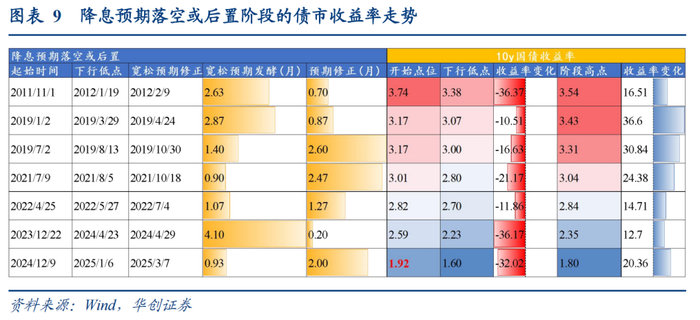 (1)岁末年初:2024年12月9日,中央政治局会议指出,“实施更加积极的财政政策和适度宽松的货币政策”,为2008至2010年之后的首次。当日10年期国债收益率在1.9%附近。年末机构“集中抢跑”叠加货币大幅宽松预期的发酵(市场部分机构对于2025年的总量工具降息的预期调整至50bp及以上),10年期国债收益率至1月初快速下行至1.6%附近。