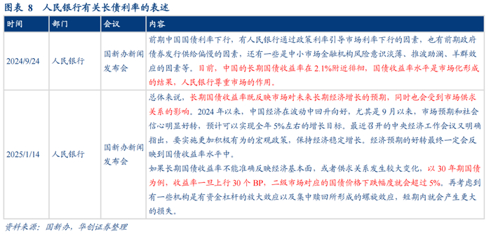 2025年1月中旬新闻发布会央行表示“投资国债并非没有利率风险、提示收益率上行30bp的风险”,对应目前10年期国债或调整至接近1.9%。1月14日,国新办介绍金融支持经济高质量发展发布会上,货政司有关领导表示“如果长期国债收益率不能准确反映经济基本面,或者供求关系发生较大变化,以30年期国债为例,收益率一旦上行30个BP,二级市场对应的国债价格下跌幅度就会超过5%”。彼时10年国债活跃券收至1.61%,30年国债活跃券收至1.86%,若均按照上行30bp考虑,10年国债、30年国债调整后分别对应1.9%、2.15%附近。