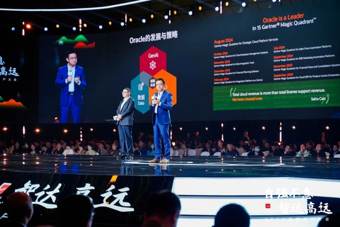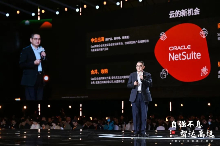 Oracle是汉得成立后的第一家合作伙伴,在数字化征程的道路上,双方卅载同舟,合作历史最为悠久。大会现场,Oracle甲骨文公司副总裁及中国区董事总经理吴承杨、甲骨文公司副总裁及Oracle NetSuite大中华区总经理叶天禄,共同带来主题演讲《AI+数据:致胜未来》。