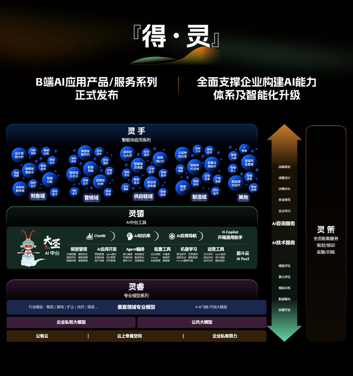 汉得经过数年投入与打磨,已经形成了名为【得·灵】的B端AI应用产品/服务系列,在本次用户大会正式发布。这一系列包括三大产品系列+一大服务系列: