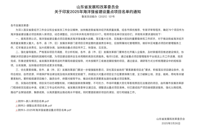 根据通知,为加快推进山东省海洋经济高质量发展,经各市择优推荐、专家评审等程序,确定79个项目作为海洋强省建设重点项目库新入库项目,动态调整后,2025年共有在库项目201个。