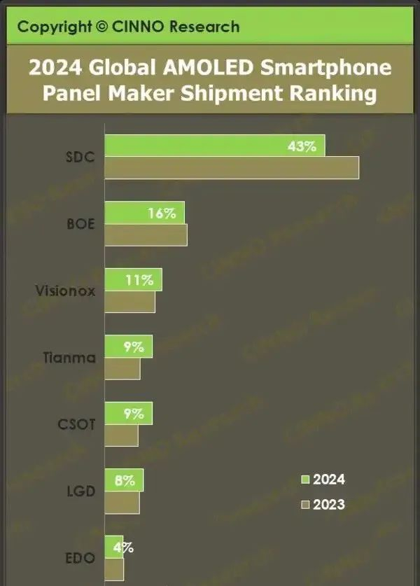 到了2024年,全球AMOLED市场,国产厂商市场份额已经接近50%;三星则只剩43%,还在持续萎缩中。