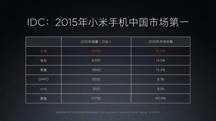 2015年,成立仅5年的小米公司,给出一份优秀的成绩单:全年售出6490万台手机,拿下中国市场第一。