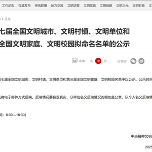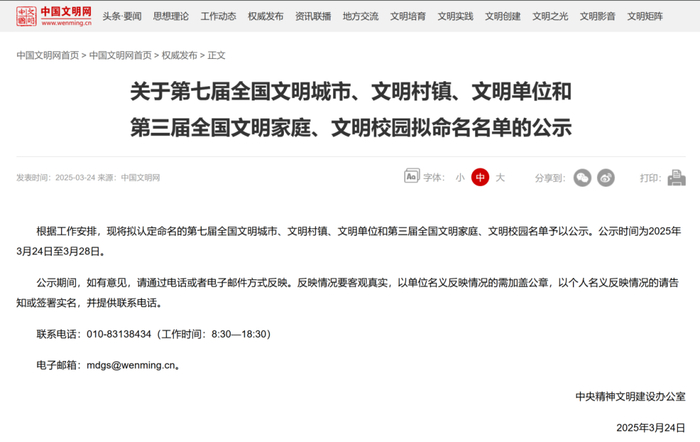 3月24日,中央精神文明建设办公室发布关于第七届全国文明城市拟命名名单的公示。公示时间为2025年3月24日至3月28日。