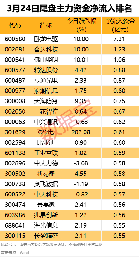 个股方面,3股获尾盘主力加仓超亿元,卧龙电驱尾盘获得的主力资金净流入规模最多,达7.31亿元。奋达科技、佛山照明的尾盘净流入资金均超亿元。