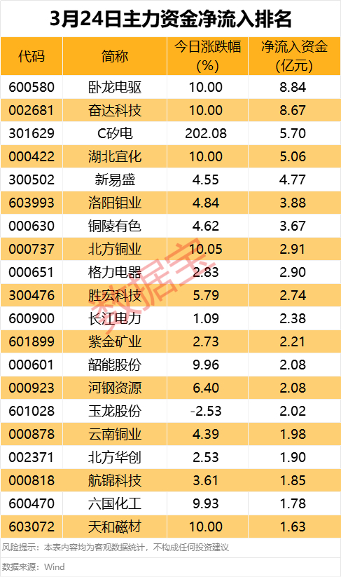 40只个股获得主力资金净流入超亿元。今日卧龙电驱的净流入额居首,该股今日涨停,全天成交金额为63.43亿元,主力净流入8.84亿元。