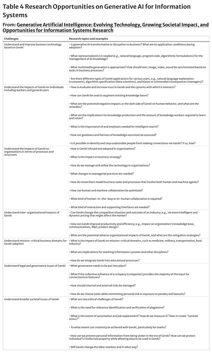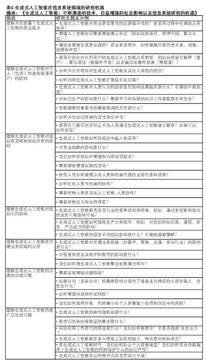 在此背景下,社会亟需系统性回应GenAI带来的根本性诘问:作为技术系统的生成式人工智能将如何改变商业活动?为了确保这项技术被富有成效、合乎道德、安全且负责任地使用,需要识别和解决哪些挑战?对生成式人工智能的价值和风险理解上的这种差距引出了我们的主要研究问题:在生成式人工智能技术及其对个人和组织的影响方面,信息系统研究能够提供哪些独特且有价值的视角?由于信息系统领域的研究通常擅长研究系统中社会和技术方面的相互联系(技术进步的社会技术属性),所以它也应该与研究和增进对生成式人工智能的价值和风险的理解相关且能够有所贡献。
