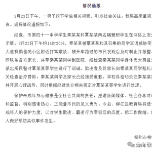 3月22日约14时20分,秦某某被覃某某和其召集的同学言语威胁带到柳南区柳工大道祥鹅佳苑小区附近打骂欺凌,被开车路过的市民发现后及时制止并报警。随后学校立即联系各方家长,并带秦某某同学到医院,经检查秦某某同学身体无大碍且无明显外伤。