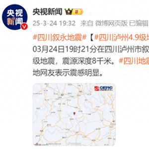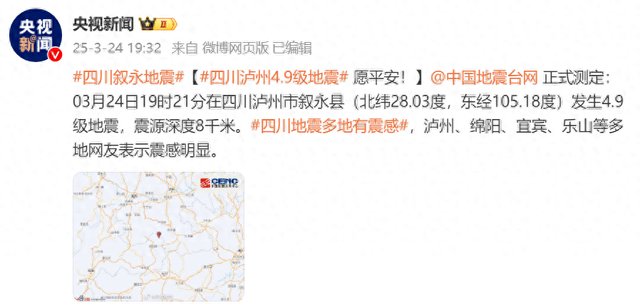 @中国地震台网 正式测定: 03月24日19时21分在四川泸州市叙永县(北纬28.03度,东经105.18度)发生4.9级地震,震源深度8千米。四川地震多地有震感,泸州、绵阳、宜宾、乐山等多地网友表示震感明显。