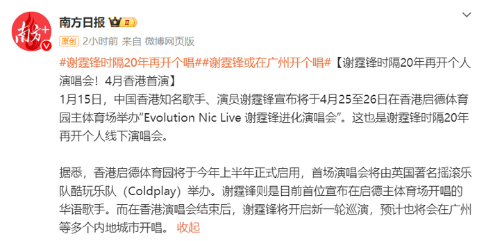 据南方日报此前报道,香港启德体育园将于今年上半年正式启用,谢霆锋是目前首位宣布在启德主体育场开唱的华语歌手。而在香港演唱会结束后,谢霆锋将开启新一轮巡演,预计将会在广州等多个内地城市开唱。
