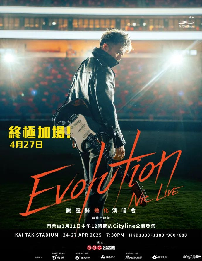 之前的预告里,谢霆锋“进化”演唱会将于2025年4月25日至26日,每晚7点30分,在香港启德体育园的主场馆举办。