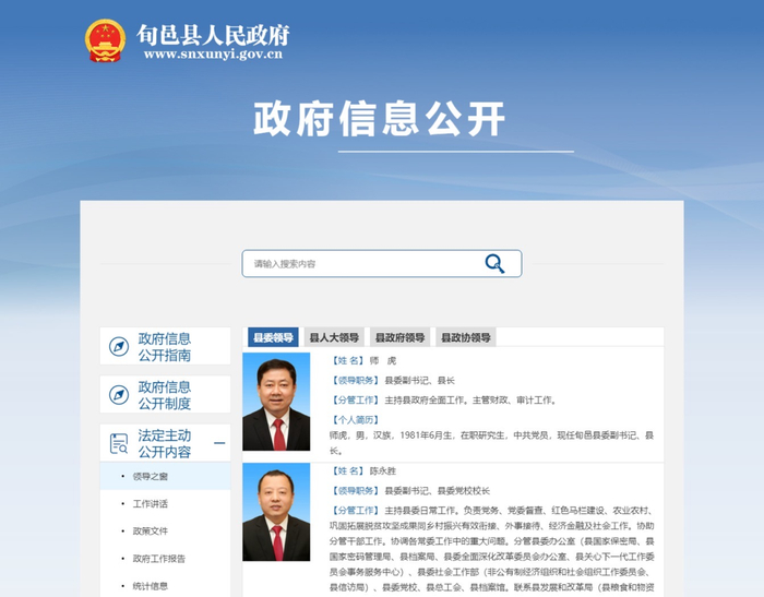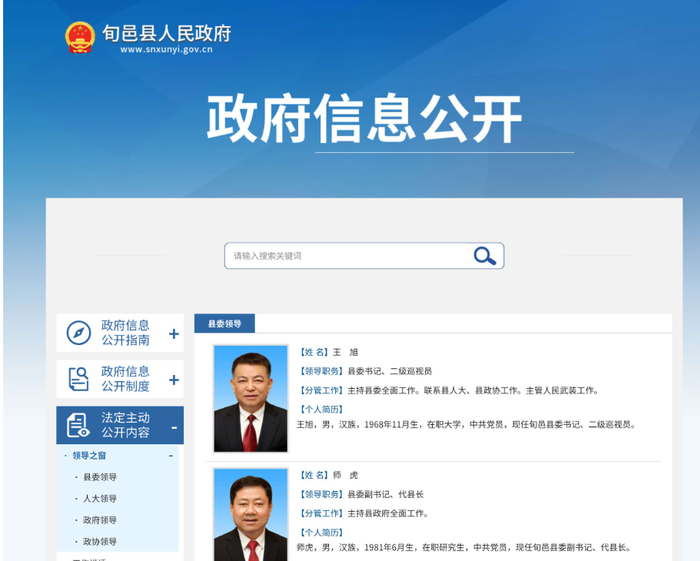 日前,澎湃新闻注意到,陕西咸阳市旬邑县政府官网法定主动公开内容-领导之窗中,已无县委书记王旭的个人信息。目前,排在领导之窗第一位的是县委副书记、县长师虎。