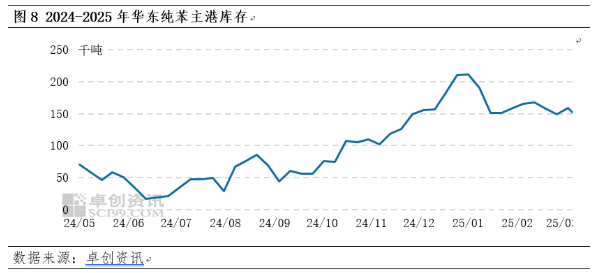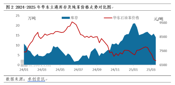 1月纯苯进口46.99万吨 2月纯苯进口51.79万吨,而2024年月均进口量仅有35.94万吨。进口量的增加,并没有体现在华东主港库存上,华东主港库存2025年1月初在21万吨,截至3月19日,华东主港库存不升反降至14.1万吨。进口多,主港库存低,考虑到液体化工品的储存难度,可以推断:下游原料库存高位。