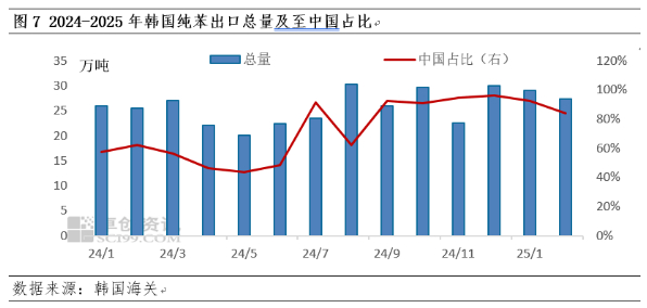 虽然1-2月美国炼厂检修,导致纯苯存在一定缺口。但由于荷兰Covestro苯乙烯装置2024年12月初听闻装置停工,重启时间待定;荷兰壳牌45万吨/年苯乙烯装置2月底停车,重启时间待定,另外POSM经济效益不佳,导致开工负荷相对偏低,从供应端来看,欧洲催化重整及乙烯裂解经济效益尚可,整体供应充足。欧洲的纯苯富余量持续出口至美国,导致美国缺口快速补充,而从亚洲进口纯苯的需求下降。亚洲纯苯出口压力转向中国。2025年韩国纯苯平均月度出口量达到28.21万吨,较2024年25.43万吨增加2.78万吨。但美国2025年从韩国进口量仅有2.68万吨/月,较2024年月均5.02万吨减少了2.34万吨。意味着2025年韩国可以出口至中国的理论量多了5.12(2.34+2.78)万吨。