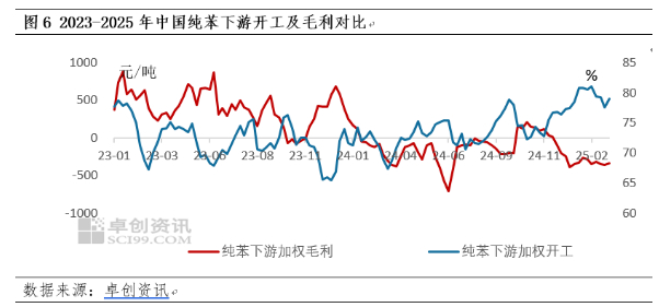 从过去三年情况来看,2023年纯苯下游综合毛利405元/吨,下游加权开工72%,而这一组数据2024年出现一些变化,下游综合毛利有正转负,2024年综合毛利为-87元/吨,开工73%。到了2025年该局面进一步加剧,下游综合毛利下降至-326元/吨,而下游综合开工上升到了79%的高位。伴随着下游的高开工,而往终端传导阻力大的问题,积累到2月中旬开始形成负反馈——下游产品库存高,终端订单不足,供需矛盾突出。
