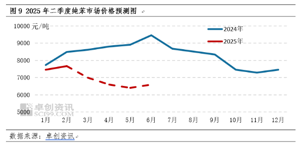 2025年一季度临近尾声,中国纯苯全球最高价虽然仍在维持,但下游及终端压力仍存,能否支撑当前苯价,需关注宏观利好消息的释放及终端去库节奏。二季度若宏观无明确利好政策支撑,纯苯仍存下行空间,预计3月下旬在6500-6800元/吨,从整体全球供需格局来看,4月均价或低于3月,预计在6600元/吨,5月-6月均价预计在6400元/吨、6600元/吨。低点或在5月出现,价格可能阶段性下探至6200元/吨。
