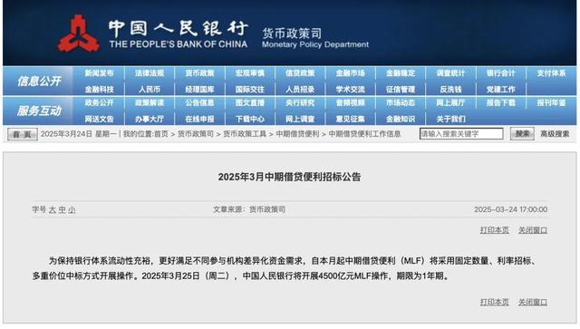 中国人民银行官网今日发布消息,为保持银行体系流动性充裕,更好满足不同参与机构差异化资金需求,自本月起中期借贷便利(MLF)将采用固定数量、利率招标、多重价位中标方式开展操作。2025年3月25日(周二),中国人民银行将开展4500亿元MLF操作,期限为1年期。