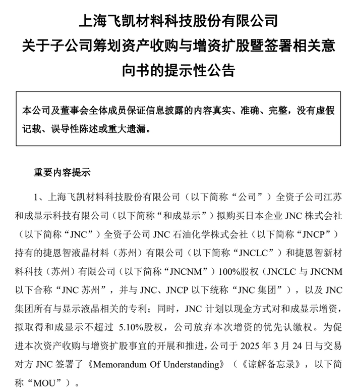 3.7亿元!飞凯材料拟收购JNC苏州100%股权及JNC显示液晶相关专利