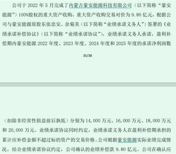 在2024年2月沐邦高科的14亿定增完成之前,也就是2022年、2023年,豪安能源完成了业绩承诺的90%,不符合业绩补偿标准。
