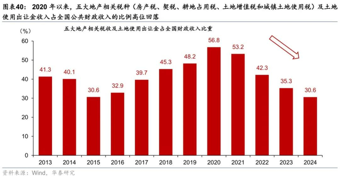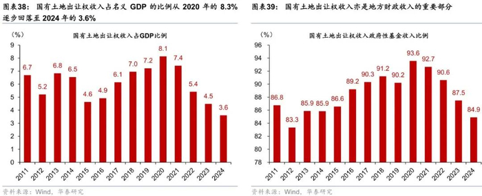 从GDP中的分配视角看,土地出让金作为财政收入的重要组成部分,2024年占地方财政收入(政府性基金收入)的85%、占总财政收入(一般公共预算+政府性基金)的接近3成。地产市场的调整,土地出让金收入占名义GDP的比例从2020年的8.1%逐步回落至2024年的3.6%。