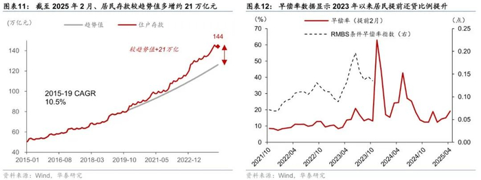 宏观意义上,生产总值(GDP)=总需求=总收入。而不被当期消费的收入定义为储蓄或投资——储蓄率越高、消费倾向越低。一方面,地产价格下行期间,居民净资产市值缩水,通胀和收入增长预期下调,真实利率上升,带动储蓄率上升、消费倾向回落。值得注意的是,提前还(房)贷也定义为储蓄。2021年中地产去杠杆周期开启以来,居民狭义(存款)储蓄从约81万亿上升至144万亿(图表11-12),更广义地,储蓄率上升、以可支配收入衡量的消费倾向从70%降至2024年68%的均值。虽然期间消费倾向受到2020-22年新冠疫情的冲击,但2023年疫后地产调整和通胀回落的影响犹存(图表10),2023-24年间,即使受到疫后低基数的提振,但年均零售也从疫情前(2015-19年)的9.5-10%的趋势增速回落至2024年的3.5%。