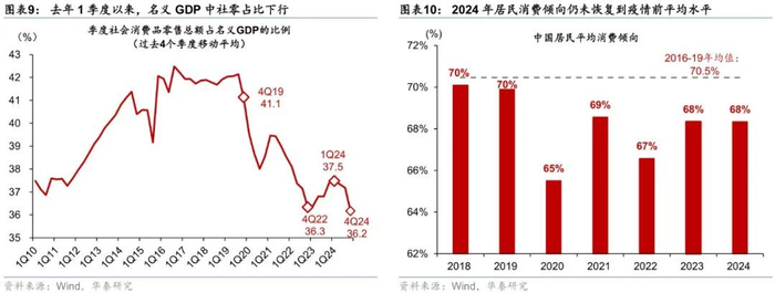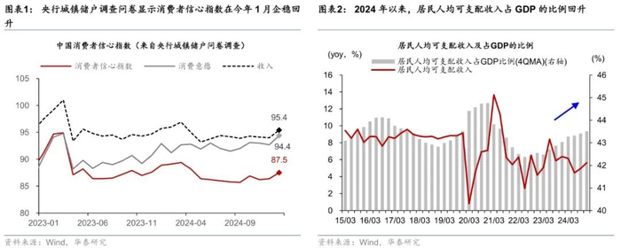 一方面,置换周期延长的耐用品可能受益于消费倾向的改善,同时,随着消费者更加专业和理性,对品质需求可能易升难降。叠加“以旧换新”政策扩围亦可能推动家电、数码产品等“焕新潮”。我们估算,以旧换新政策增量扩围有望拉动社零年化增速1个百分点左右。根据商务部统计,2024年以旧换新补贴1,500亿元共计拉动1.3万亿相关产品销售额,而今年补贴总额拟将增加到3000亿,1月初已下达810亿元。我们估算,若补贴总额扩大至3,000亿元,考虑递减效果假设带动额外消费额的拉动系数在1.5-2左右,“以旧换新”或带动社零年化增速0.9-1.2个百分点。而从品类层面,新增手机、平板、智能手表(手环)补贴,汽车报废范围扩展,家电增加品类(+净水器、洗碗机、电饭煲和微波炉),同时允许地方自主增加品类;继续给家装厨卫材料“焕新”给予补贴,鼓励地方探索以装修合同为依据开展补贴。