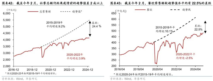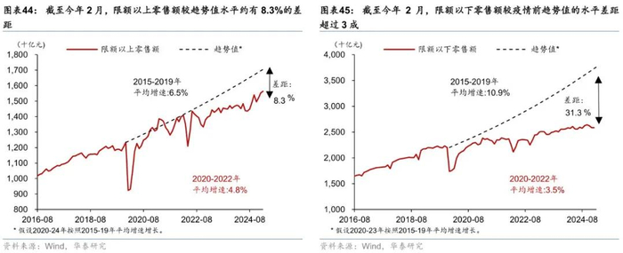 整体而言,截至今年2月,社零消费总额仍距离疫情前趋势值有2成以上的差距,显示此前受到抑制的消费需求或部分延迟。其中,餐饮消费距离趋势值的降幅约为22.5%。此外,限额以上和限额以下消费呈现明显分化,限额以下消费额较疫情前趋势值差距超过3成,相对而言,限额以上消费距离趋势值的差额不到1成。而限额以上消费分品类来看,家电在去年以旧换新政策的提振下降幅明显收窄,从23年底的3成左右差距收敛至今年2月的2成左右。