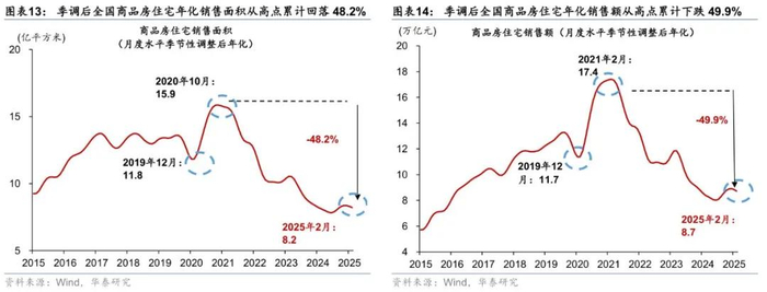 2025年,中国增长开局较为积极,在外需不出现超预期收缩的环境下,名义增长有望企稳,且地产调整周期进入第四年,出现早期的成交量“磨底”迹象。如我们在《中国地产:分化中的积极信号及其宏观涵义》(2025/3/24)中所分析,。统计局数据显示,中国新房成交量年化水平从2021年中的高点逐步回落,而百强房企和60城商品房口径的累计降幅已接近其他国家地产调整区间上限。