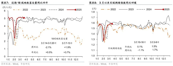 而从中观层面数据上、部分消费领域亦出现早期企稳的迹象,尤其在出行、体验式消费等层面。相较于去年春节假期后消费需求及价格指标走弱,今年部分消费量价有边际企稳——3月以来,百城拥堵指数、地铁客运量同比上行。3月1-16日,乘用车日均零售销量同比上行16.8%、或显示以旧换新政策的提振。3月以来,二手房成交同比仍在高位、尤其一线城市在高基数下继续回升,或显示大城市居民购房需求偏强。价格指标层面,机票、酒店价格同比降幅亦有所收窄。3月1-16日,全国整体酒店平均每日房价(ADR)环比上行1%左右,同比降幅收窄至1%,国内航线均价同比回落5.2%,但最新一周航线均价开始回升,环比上行3.2%(图5-6)。考虑到去年二季度社零同比回落至2.7%的低基数水平,或对3-4月同比形成一定支撑。