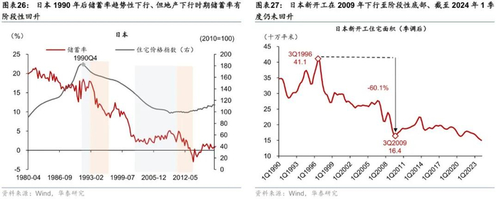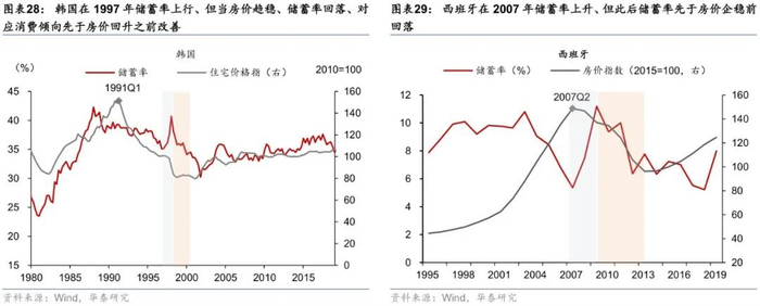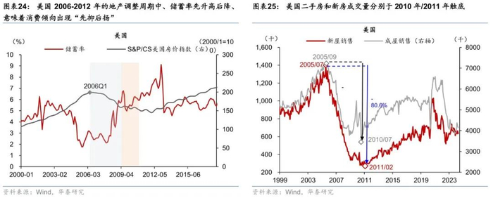 美国:回顾2006-2012年的地产调整周期,房价指数从2006年触顶、随后一路走低,对应居民部门储蓄率于2007年末跳升、虽然房价指数直到2012年2季度才触底,但从2009年2季度起、储蓄率便有所回落、对应消费倾向边际改善、虽然储蓄率仍结构性的高于2009年之前、但回升斜率明显放缓。美国房价从2006年至 2008 年末,衡量 20 个大中城市的标准普尔/CS 房价指数下跌 24.5%,而失业率在 2009 年达到 9.3%,当年的工资水平亦较前一年下降超过4%,收入增速下行冲击了居民消费。在此期间,成屋销售在2009年末一度开始回升、同期储蓄率亦有大幅回落、此后虽然小幅回升、但截至2011年新房销售触底、居民储蓄率水平低于房价下行时的高点。