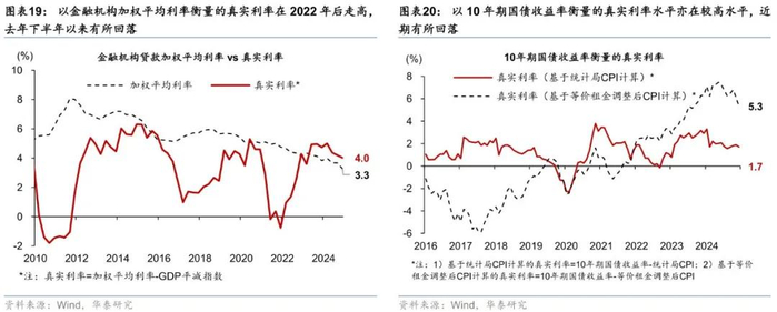 伴随着地产周期调整,真实利率亦上行,对总需求增长形成压制。当实际利率较高时,消费者可能更倾向于储蓄而减少当前消费,以获取未来更高的回报。而当实际利率较低时,消费者可能会更愿意提前消费。而不论以GDP平减指数、还是以统计局公布CPI、以及等价租金调整后CPI来衡量,地产周期调整以来,真实利率水平回升,对居民消费及投资需求形成抑制,而在去年下半年稳增长政策逐步落地后,呈现边际改善,近期开始有所下降(图表19-21)。