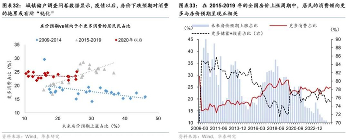 虽然地产带动投资、消费的品类广、链条长,但购置房产在宏观意义上仍是投资、而非消费行为。只是因为地产和经济上行周期往往同步,地产周期和居民消费增长在很多时段呈现正相关的特性。对中国而言,此前在房价上涨预期背景下,居民净资产有较强升值预期,其投资属性一定程度上对冲了地产对消费的“挤出”效应。根据央行的城镇储户调查问卷数据显示,在不同阶段,预期房价上涨的居民占比和对应选择增加消费的占比的相关性有所不同,在2009至2014年期间主要呈现负相关关系,即预期房价上涨或导致更多居民减少消费,而在2015-2019年,房价涨幅较高的时段,整体呈现正相关关系,即房价对居民净资产的财富效应驱动居民选择更多消费,然后在2020年以后、房价上涨预期明显回落,而居民选择是否更多消费则与之基本不相关,即房价对消费的影响或有所“钝化”。